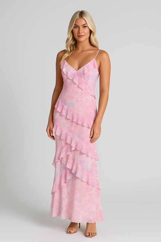 Boho Chic - Trykt Kjole Med Flæser og V-Udskæring til Aftenbrug