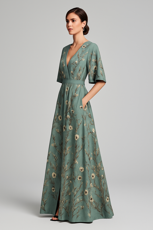 LOVA – V-hals Maxi Kjole med Elegant Fald